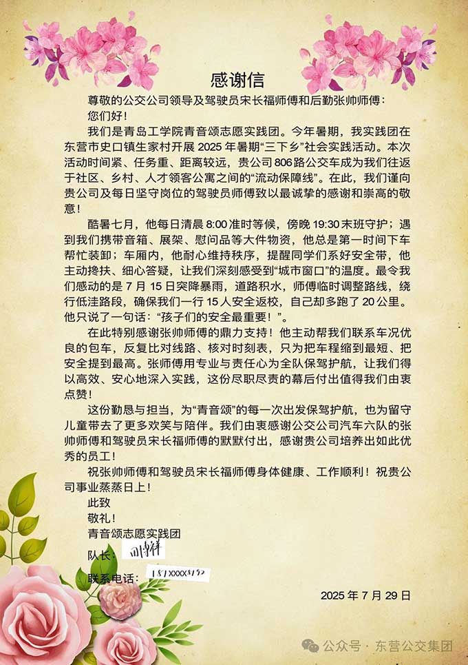 近日,青島工學(xué)院青音頌志愿團(tuán)發(fā)來一封感謝信,感謝東營市公交集團(tuán)駕駛員宋長(zhǎng)福師傅熱情服務(wù)。原來,在今年...